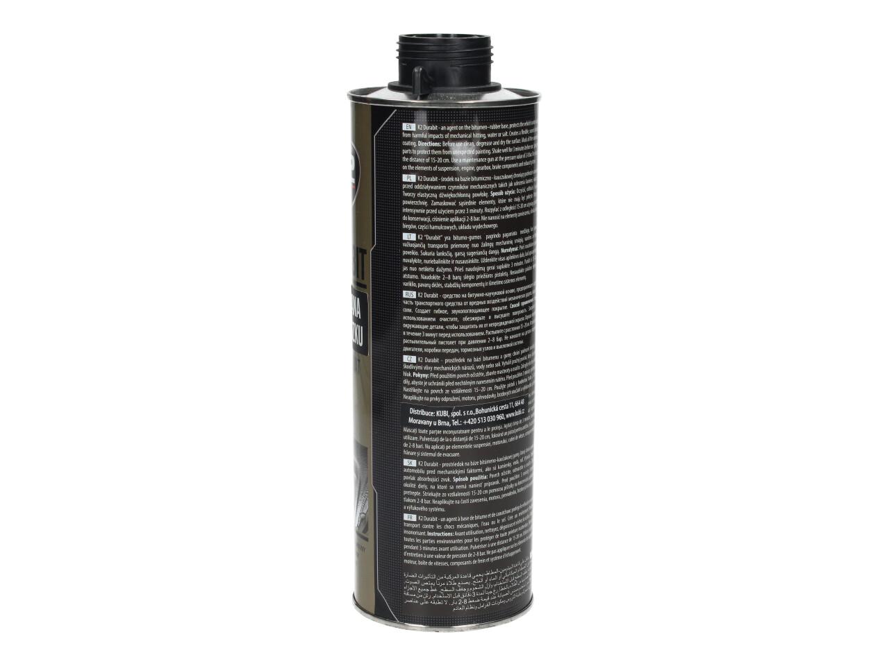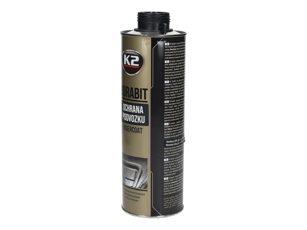K2 DURABIT 1 L je odolný a účinný prostředek na údržbu podvozku, prahů a rámů vozidel, určený k nanášení pistolí nebo štětcem. Na bázi bitumenové pryže vytváří pružnou a odolnou vrstvu, která chrání povrch před nárazy kamínků, vodou, solí i korozí. Současně tlumí hluk a vibrace, čímž zvyšuje komfort jízdy a prodlužuje životnost vozu.
