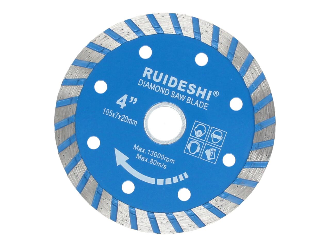 Diamantový řezný kotouč Ruideshi o rozměrech 105 × 7 × 21 mm je určen pro použití s úhlovou bruskou a je vhodný pro řezání široké škály stavebních materiálů. Skvěle se hodí na cihly, střešní tašky, beton, žulu, mramor, keramické potrubí, keramickou dlažbu a další podobné materiály.