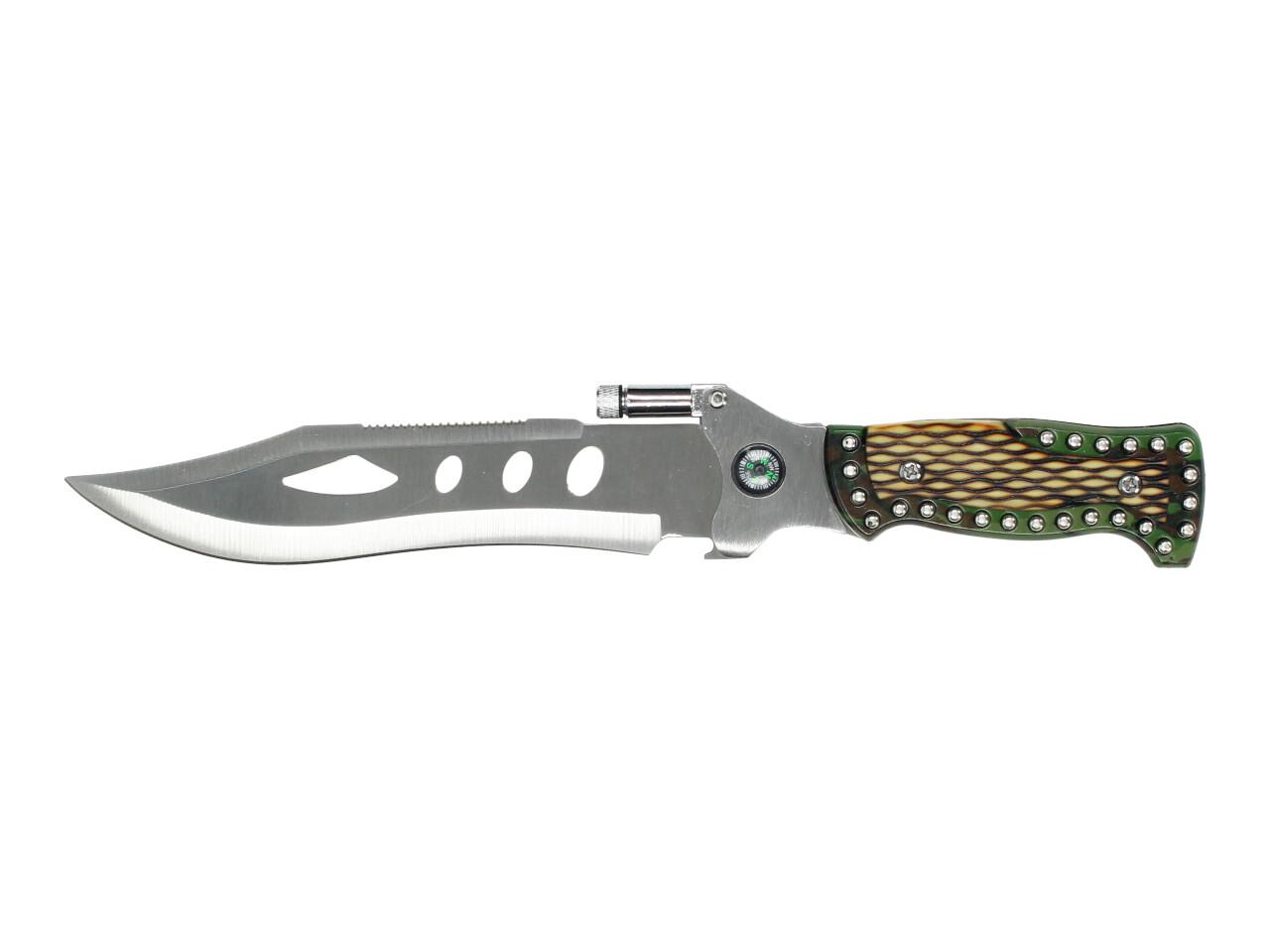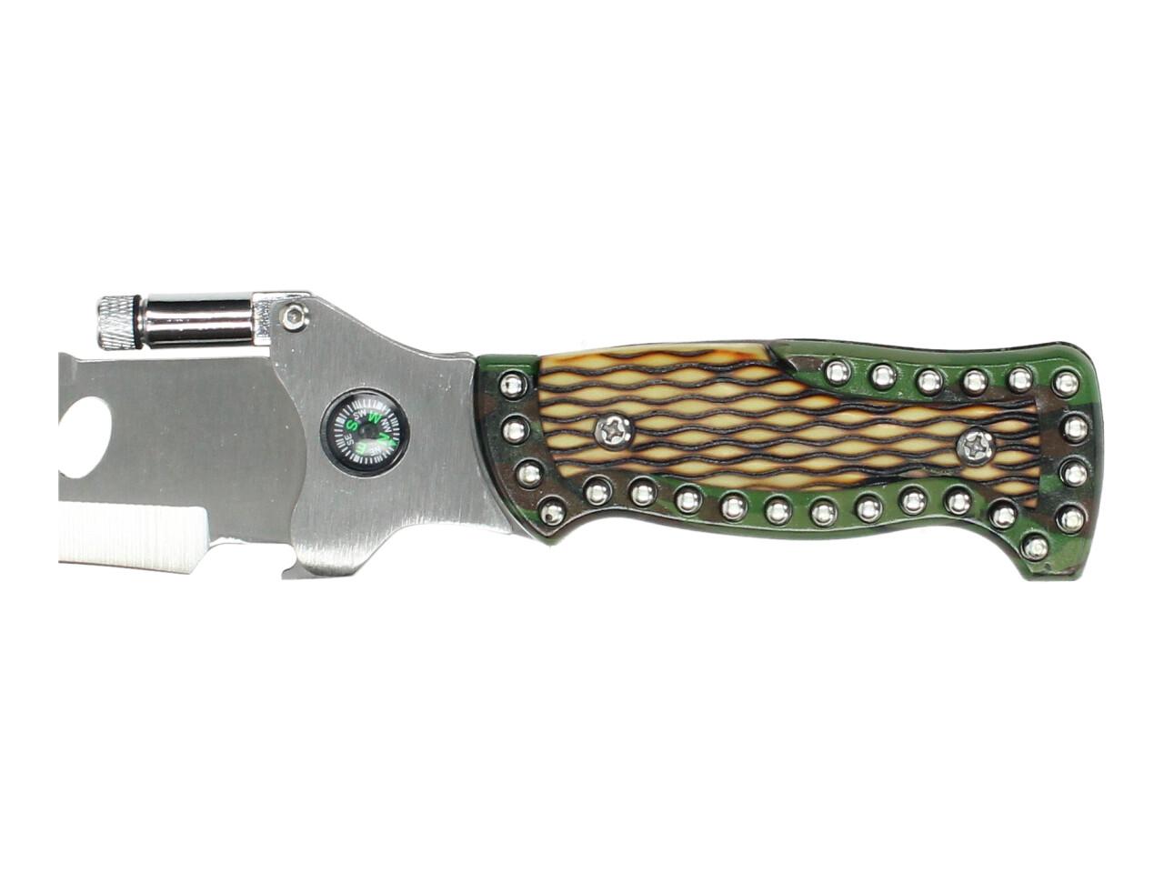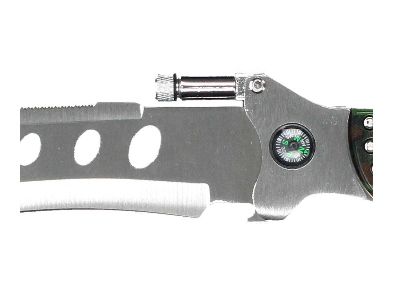 Nůž 3v1 je praktický pomocník pro běžné outdoorové použití, kempování, pobyt v přírodě nebo jako zajímavý doplněk výbavy. Kromě samotné čepele nabízí také integrovanou mini svítilnu, kompas a pilku na hřbetu čepele, takže spojuje více funkcí v jednom nástroji.