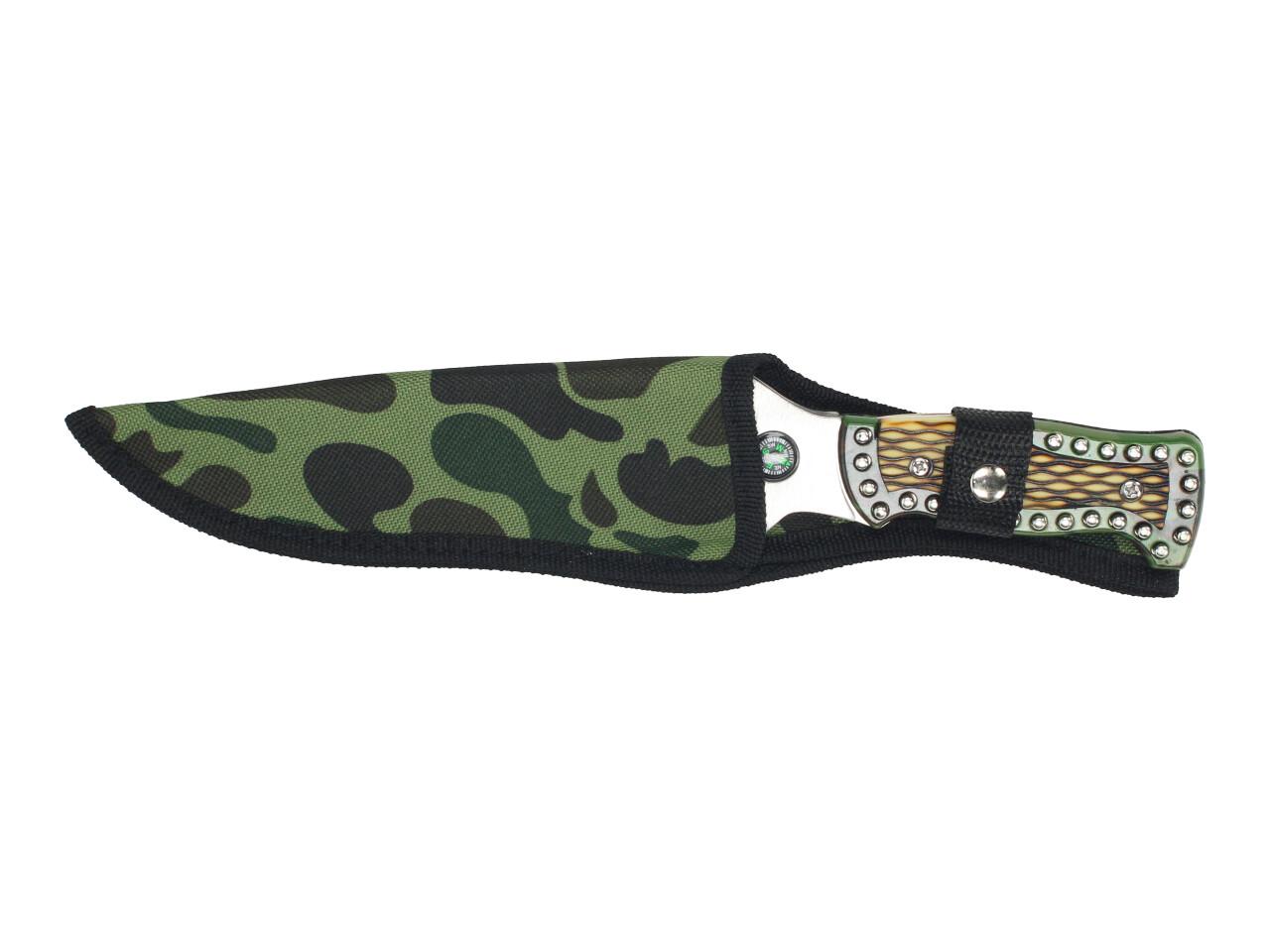 Nůž zaujme také svým výrazným provedením se zdobenou rukojetí v zeleno-khaki stylu. Součástí balení je i textilní khaki pouzdro, které usnadňuje přenášení a chrání nůž při uložení. Díky kombinaci funkcí se hodí pro nenáročné použití na cestách, na chatě nebo při pobytu venku.